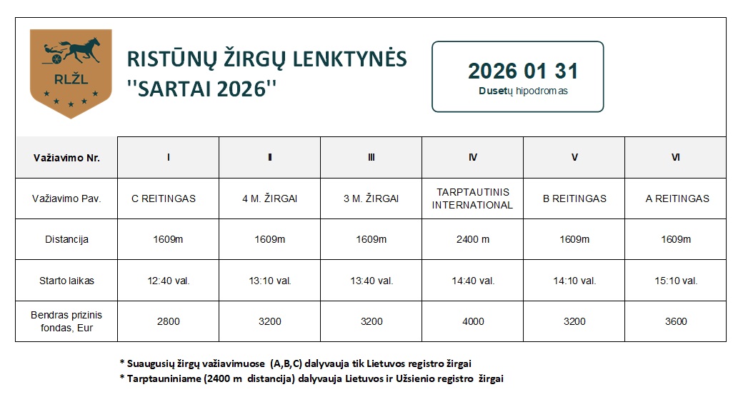 • LENKTYNIŲ DALYVIŲ REGISTRACIJA: kviečiame vadeliotojus registruotis sausio 31 d. nuo 8.00 val. iki 9.00 val. Kavolių kaimo arklidžių patalpose. Dėl renginio svarbos, padidinto dėmesio bei saugumo, bus tikrinamas vadeliotojų blaivumas. Taip pat prisistatyti mandatinei komisijai ir pateikti sveikatos pažymą (galiojančią) ir gyvybės draudimą.